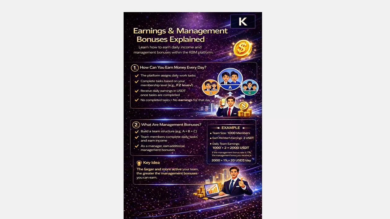 Learn how to earn daily income and management bonuses within the KBM platform.